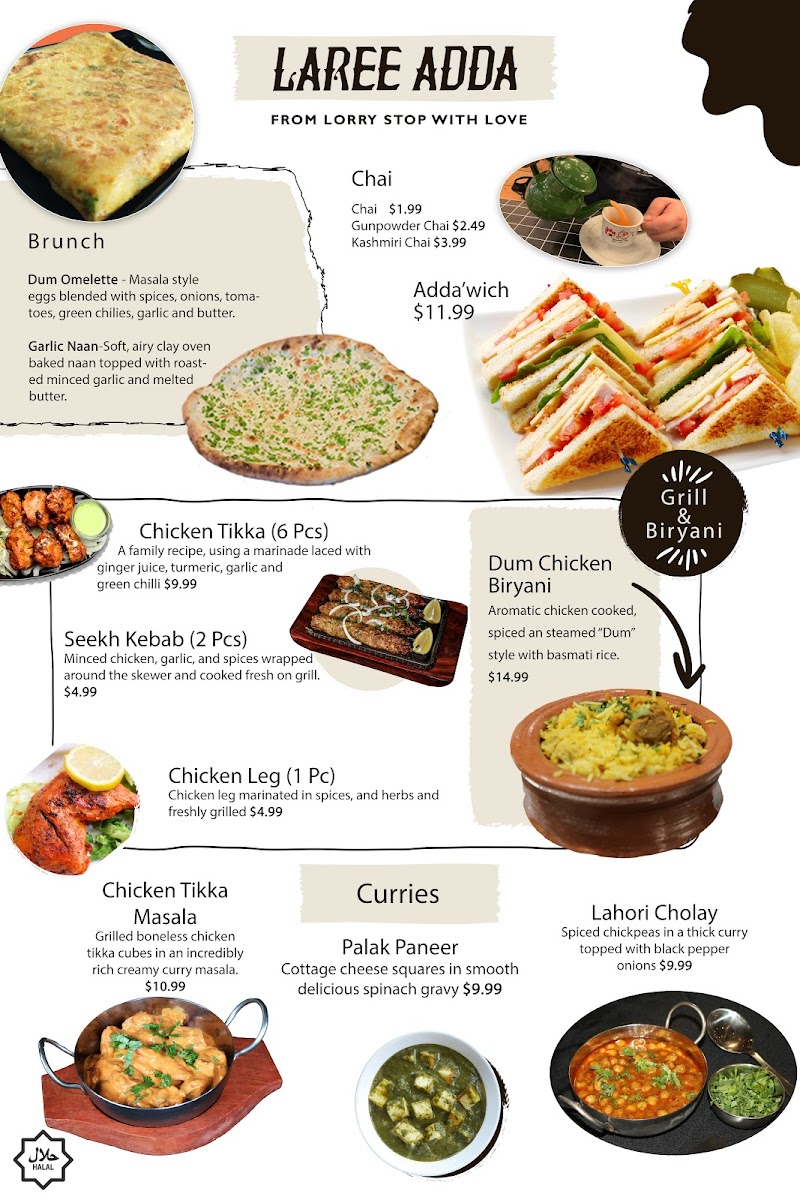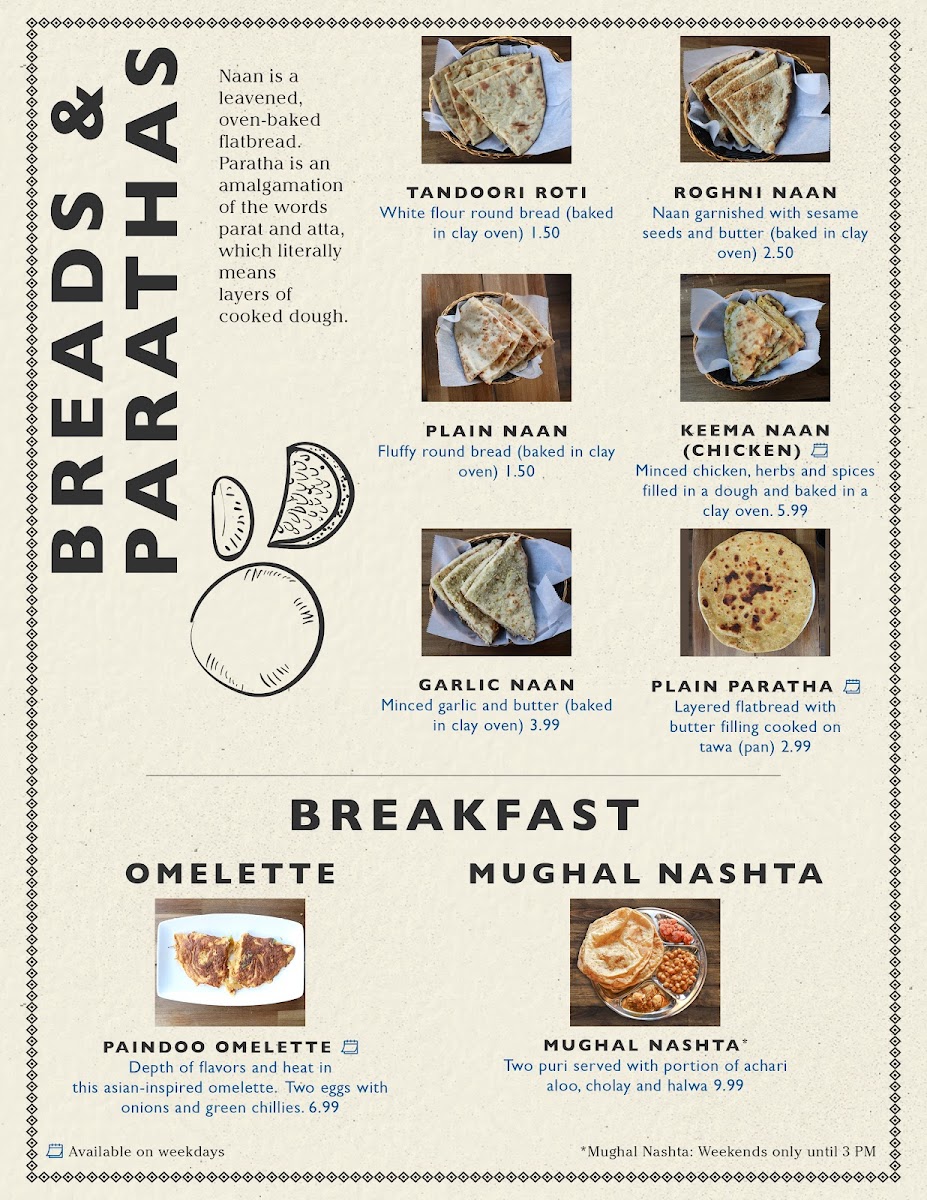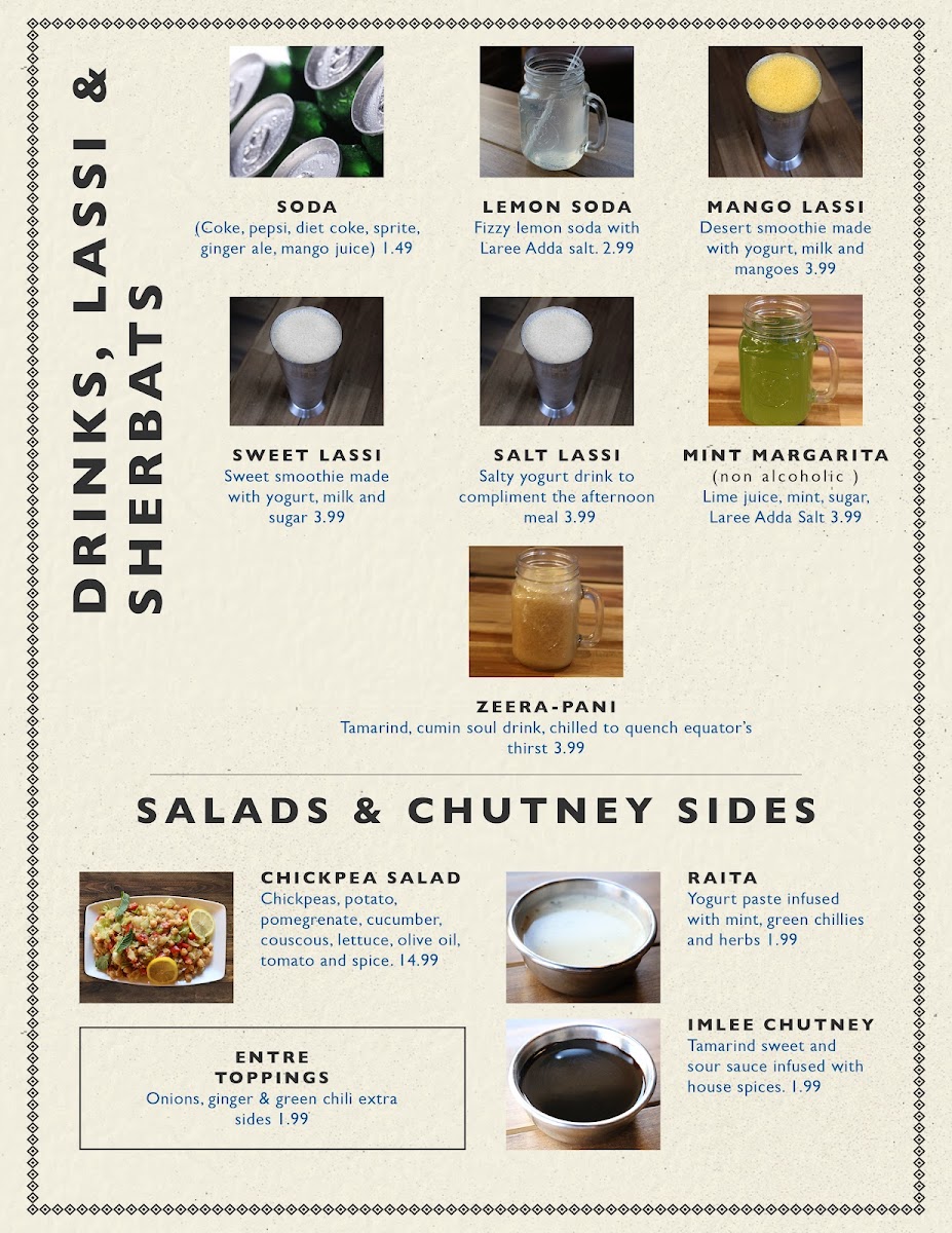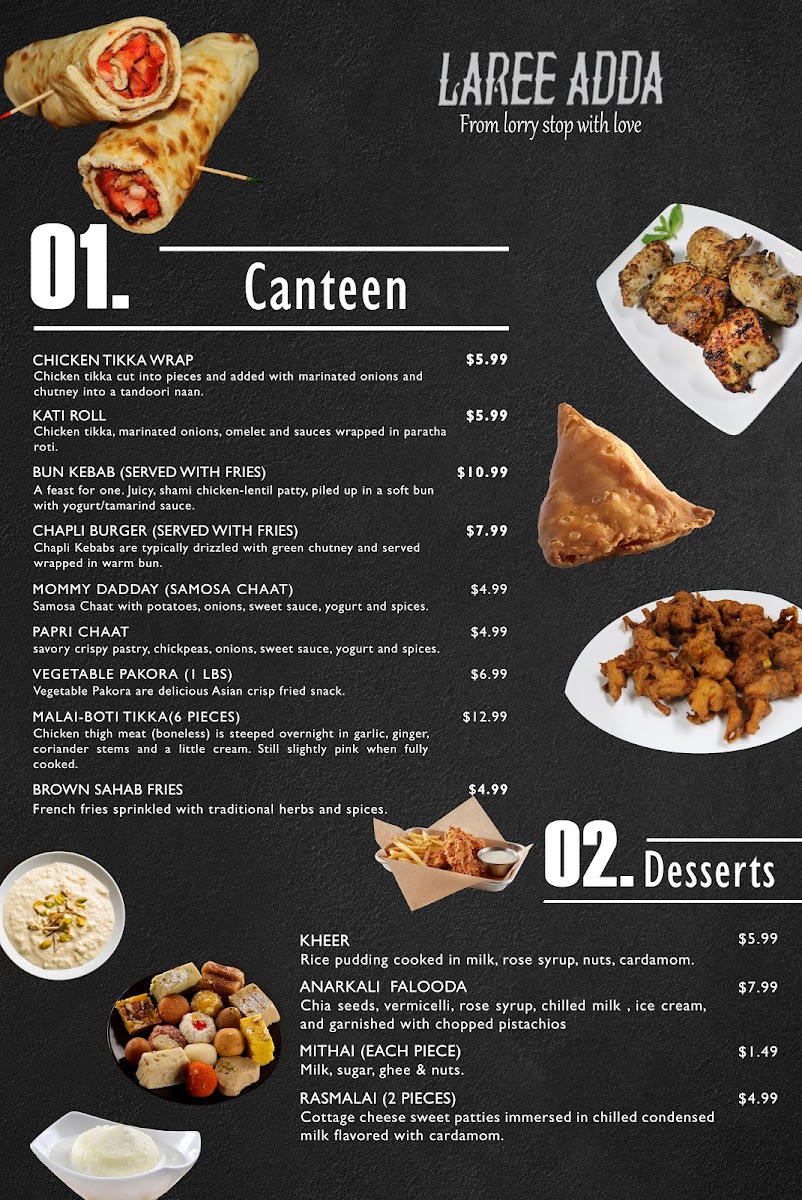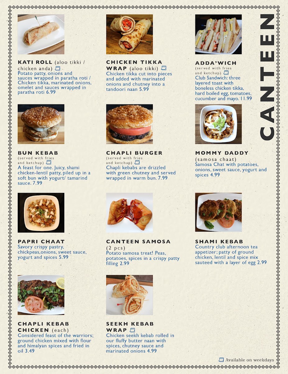 Potato patty, onions and sauces wrapped in paratha roti / chicken tikka, marinated onions, omelet and sauces wrapped in paratha roti.