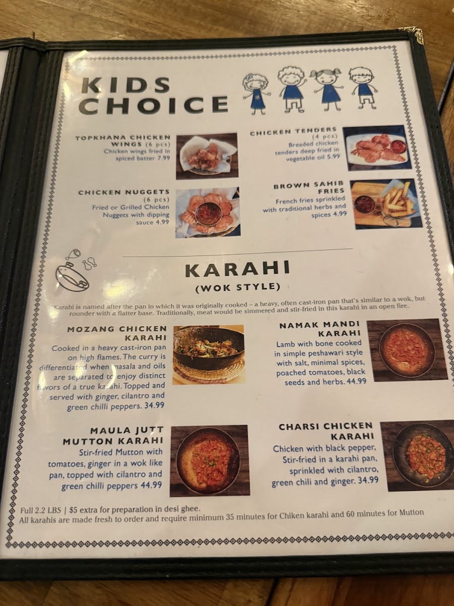 Cooked in a heavy cast-iron pan on high flames. The curry is differentiated when masala and oils are separated to enjoy distinct flavors of a true karahi. Topped and served with ginger, cilantro and green chilli peppers.